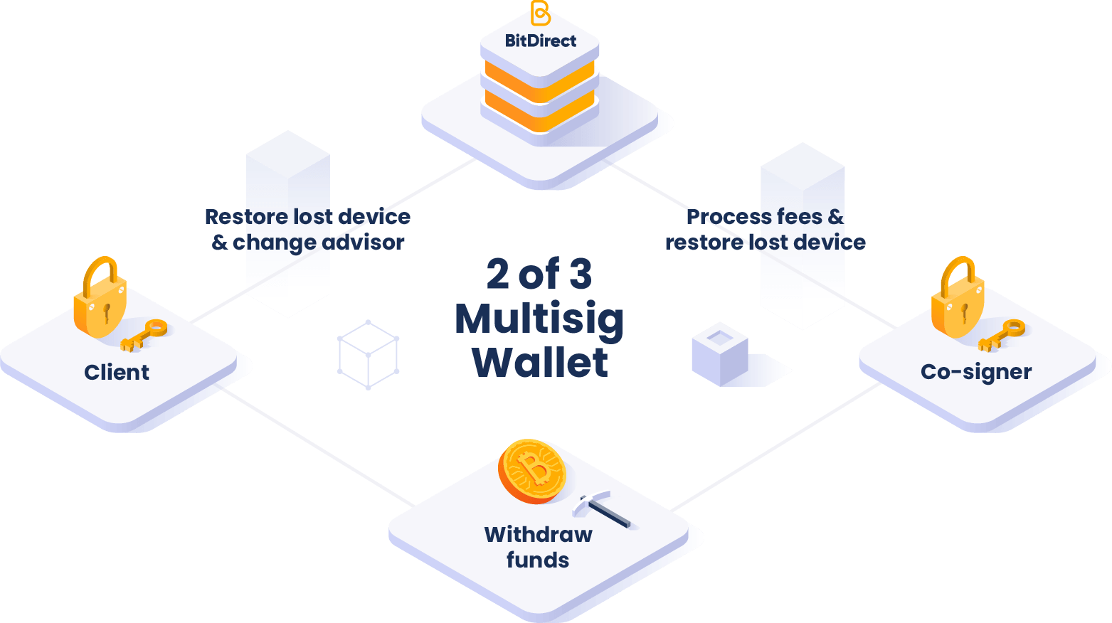 The Advisor and Client control 2 out of 3 keys so they can move funds via a third party wallet provider without BitDirect.